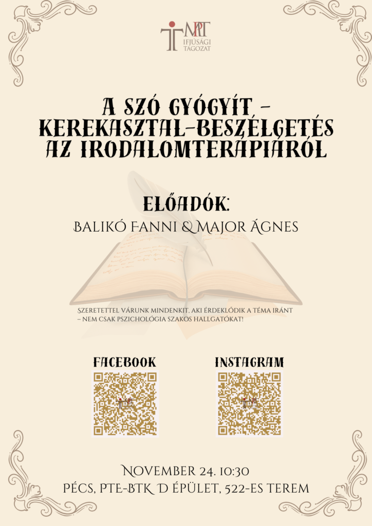 A szakmai beszélgetés során vendégeink megosztják tapasztalataikat arról, hogyan lehet valakiből irodalomterapeuta, és miként építhető be az irodalomterápiás módszertan a segítő hivatásba. Az eseményen megismerkedhettek a PTE Biblioterápia szakirányú továbbképzés oktatóival és végzett hallgatóival is.